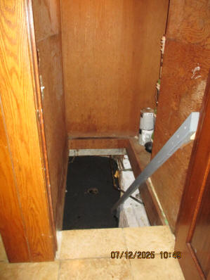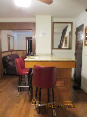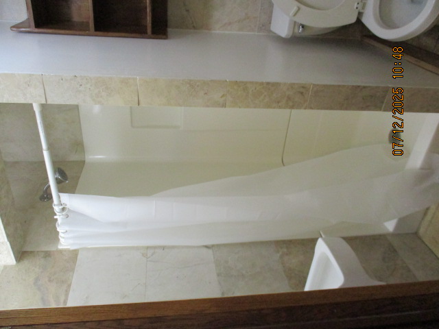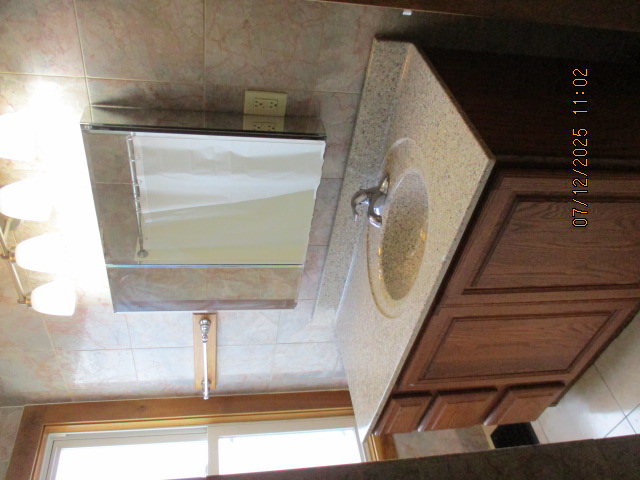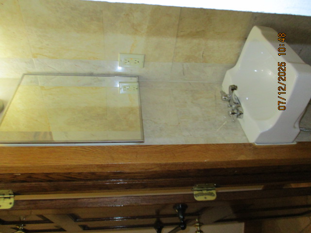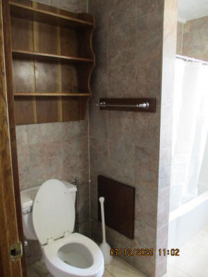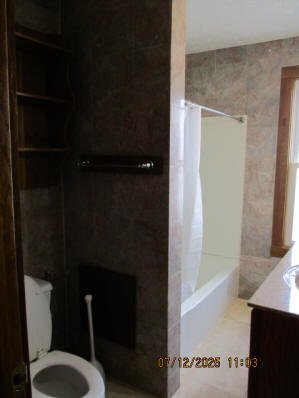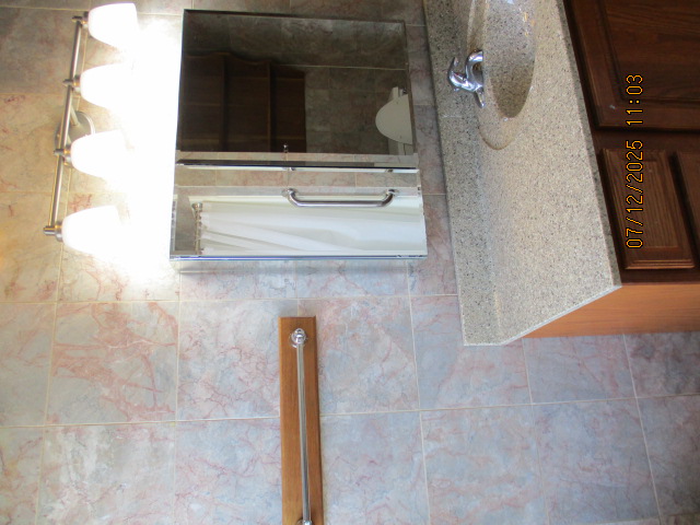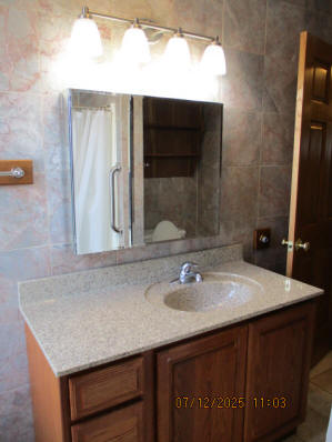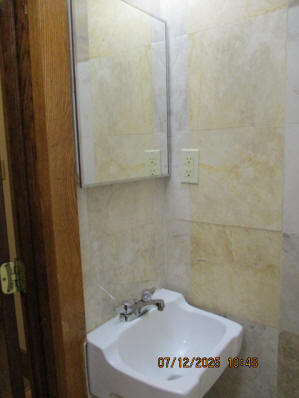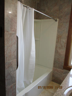 Downstairs Bathroom with Marble walls with Shower, Entry door to basement