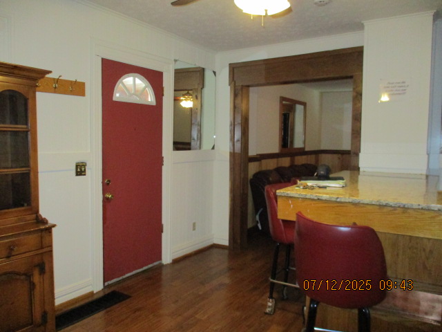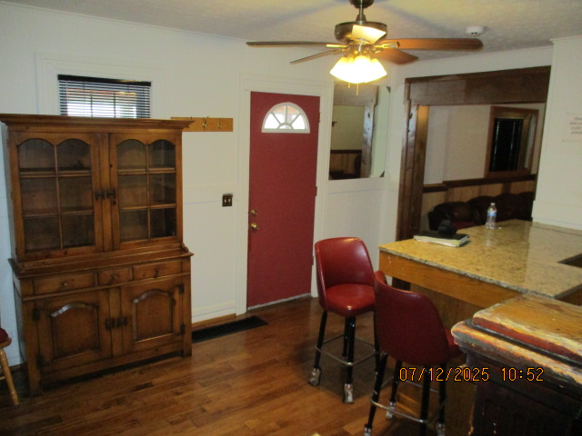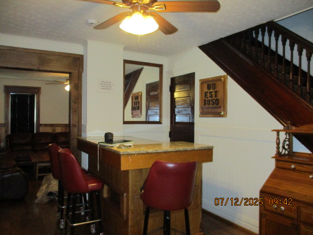 black walnut shelf, tile flooring, ceiling fan, microwave and dishwasher
