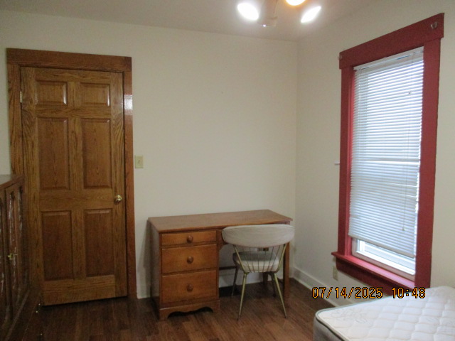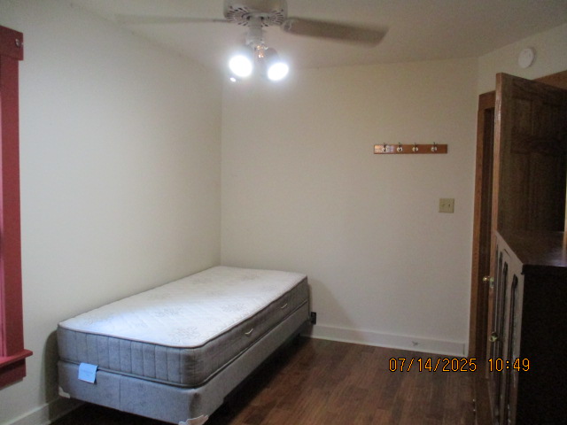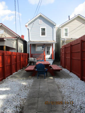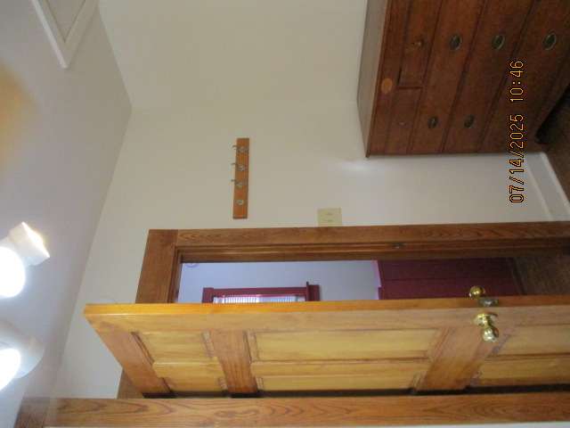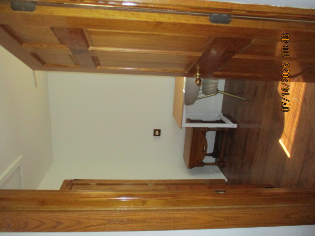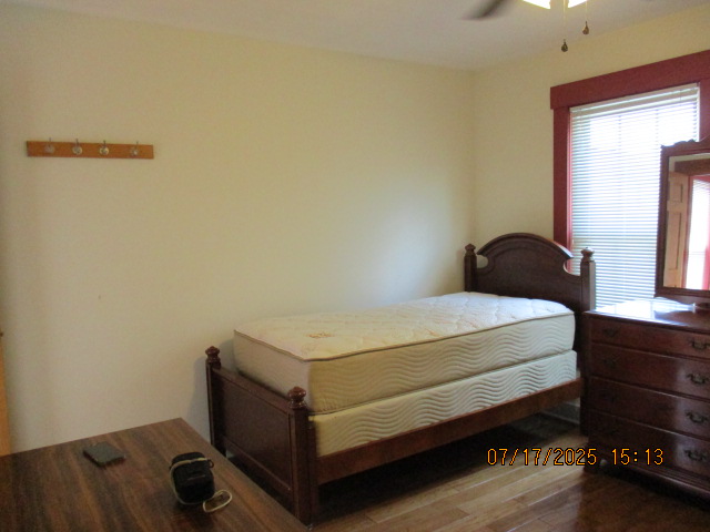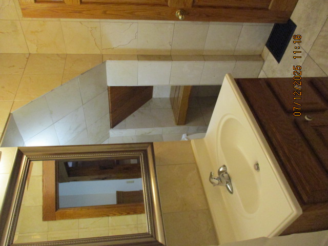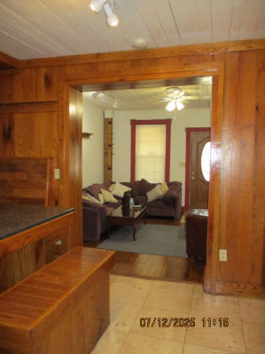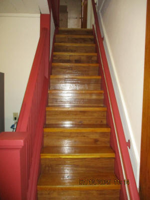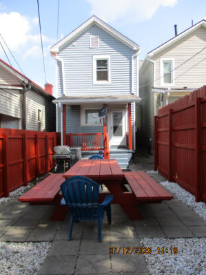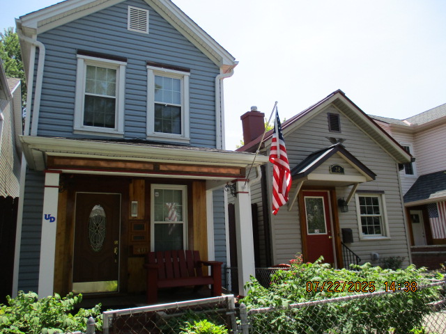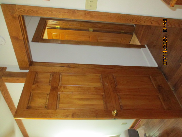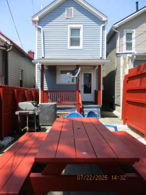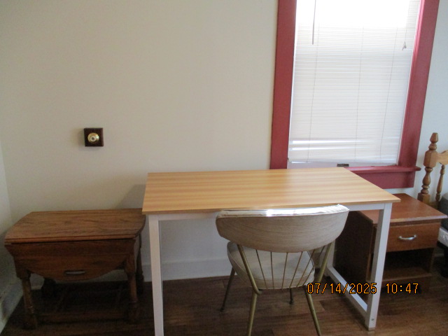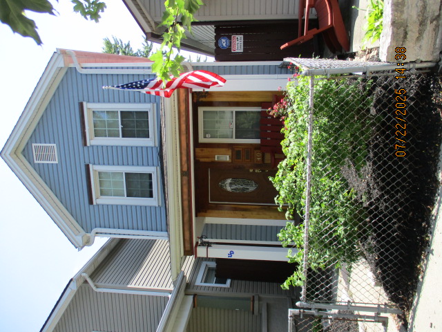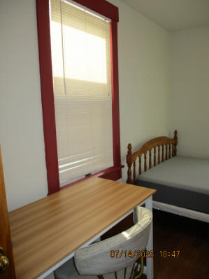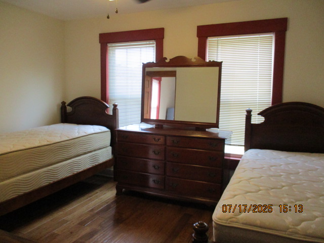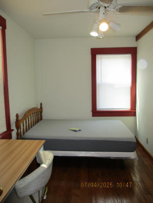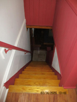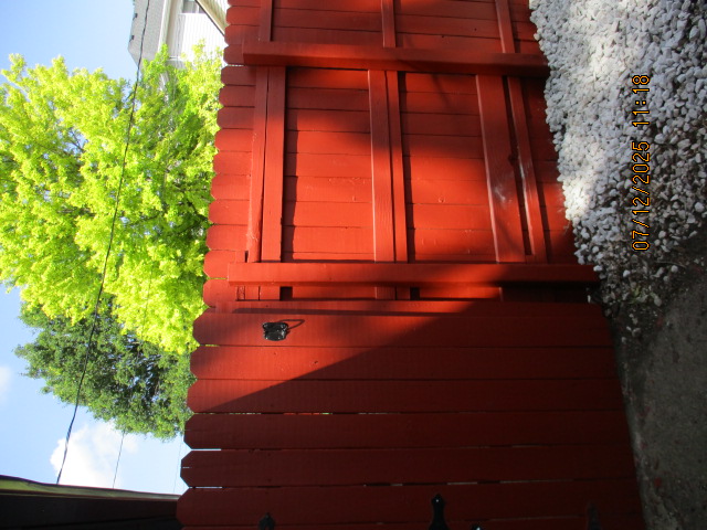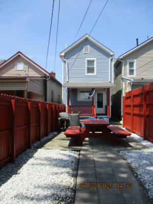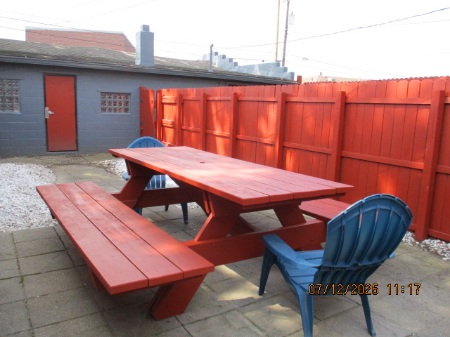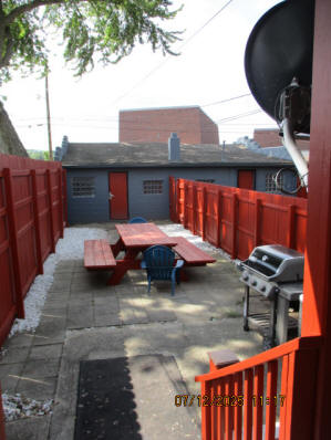 Kitchen with butcher block countertops with farmhouse sink, tile flooring, custom built oak table with blue coral granite top, custom built wood staircase, cherry cabinets. Downstairs bathroom with Italian marble walls, oak vanity and tile flooring, commercial bathtub/shower Washer and dryer area with Speed Queen washer and dryer set, hallway, storage basement off of laundry area Privacy fenced in backyard with back patio area with picnic table, gas grill and gas firepit Upstairs bathroom with Italian marble tile walls, tile flooring, and bathtub/shower, and upstairs hallway and landing. Back upstairs bedroom currently with full bed, desk, dresser, ceiling fan, and cedar lined closet Middle upstairs bedroom currently with twin bed, desk, dressers, ceiling fan and cedar lined closet Front upstairs bedroom currently with two twin beds, desk, dresser, ceiling fan and cedar lined closet This page last updated 07/29/2025