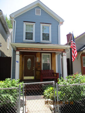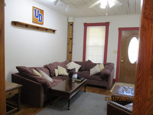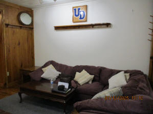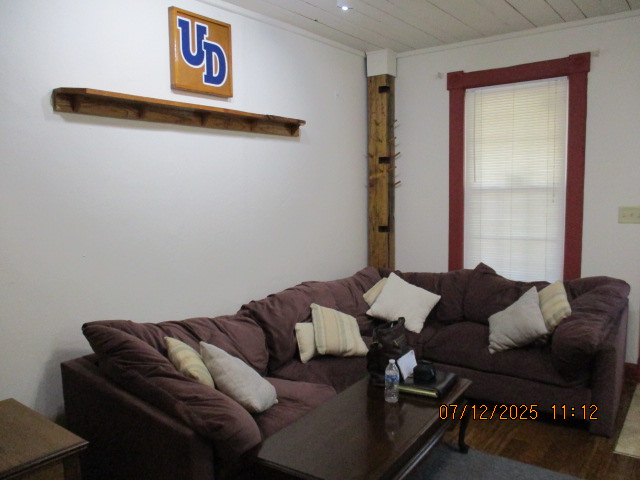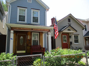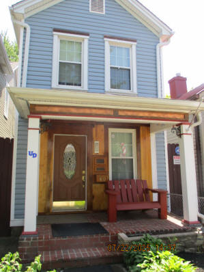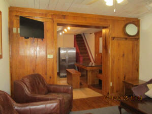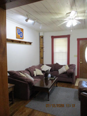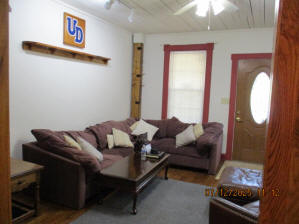 40 Jasper Street Old school hickory wood flooring in living room and upstairs bedrooms; tile flooring in kitchen and bathrooms; kitchen with butcher block countertops and farmhouse sink; kitchen also includes custom built oak kitchen table with blue coral granite top, cherry kitchen cabinets; two bathrooms with Italian marble tile walls, commercial bathtubs, and tile flooring; brick front porch; custom built coffee table; wall mounted television in living room; back patio area with picnic table, gas grill and gas fire pit. This property has the following features: 3 bedrooms, 2 bathrooms with Italian marble tile walls, central air conditioning, premium leather living room set, beautiful wood ceiling with track lighting in living room, washer and dryer, privacy fenced in backyard with back patio area. Best of all, you are half a block from campus and all the fine restaurants!! **As with all our properties, maintenance is included.* (Click on any of the pictures below to see an enlarged views) Front views with brick front porch with new custom oak wall with black walnut accents, custom built adirondack chair, and planter box. Right next to our home at 38 Jasper (tan siding) Living Room with premium sectional sofa, leather love seat, old school hickory wood flooring, wall mounted television, ceiling fan, and wood ceiling with track lighting.