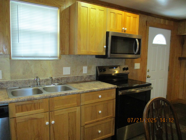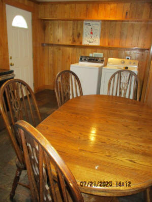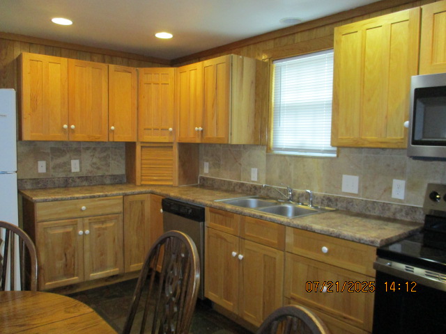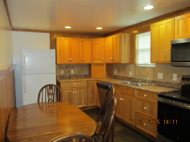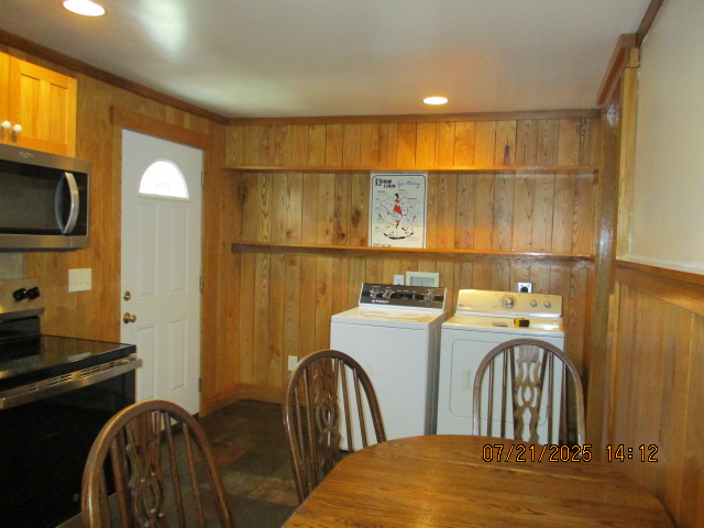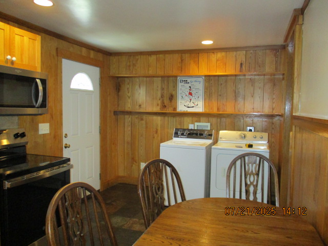 Kitchen with hickory cabinets, oak wainscoting, microwave, dishwasher, premium commercial grade washer and dryer, steel back entry door, and slate tile flooring.