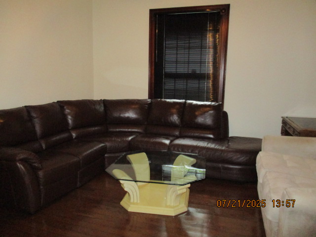 Living Room with solid oak wood flooring, ceiling fan, leather sectional sofa, and steel front entrance door with black walnut trim, hallway leading to downstairs bedrooms. Front downstairs bedroom with solid oak wood flooring, cedar lined closet, currently with queen wood bed, desk, dresser, and ceiling fan.