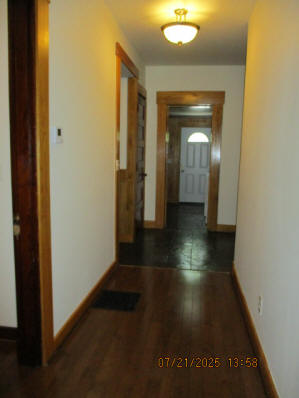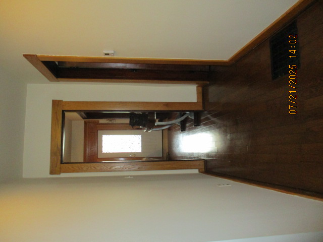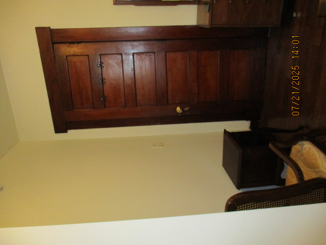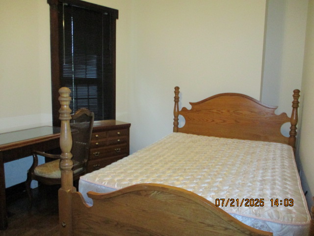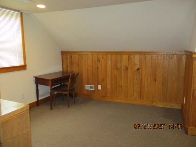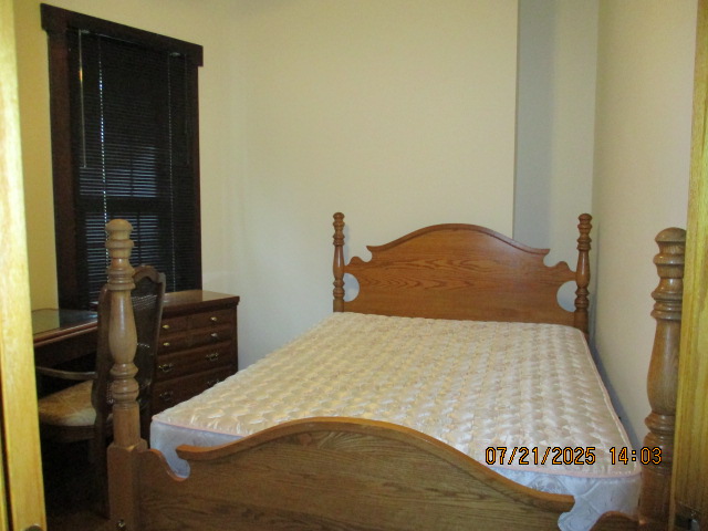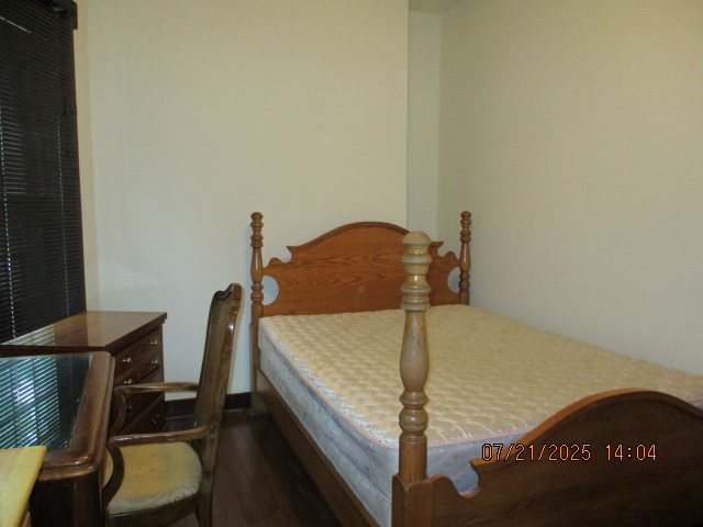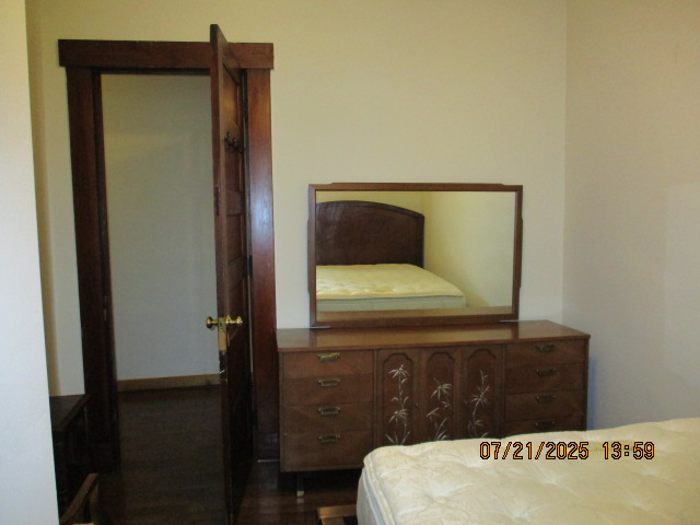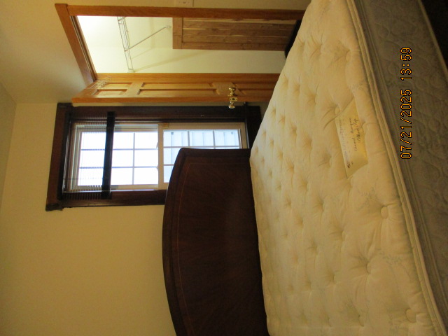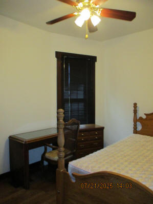 Middle downstairs bedroom with solid oak wood flooring, cedar lined closet, ceiling fan, and currently with queen bed Downstairs study area and hallway leading to bathroom, upstairs loft area, and basement entrance, study room currently with full bed, desk, and dresser
