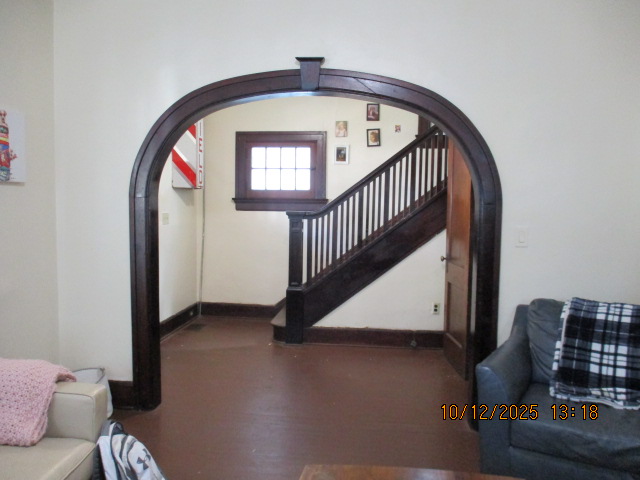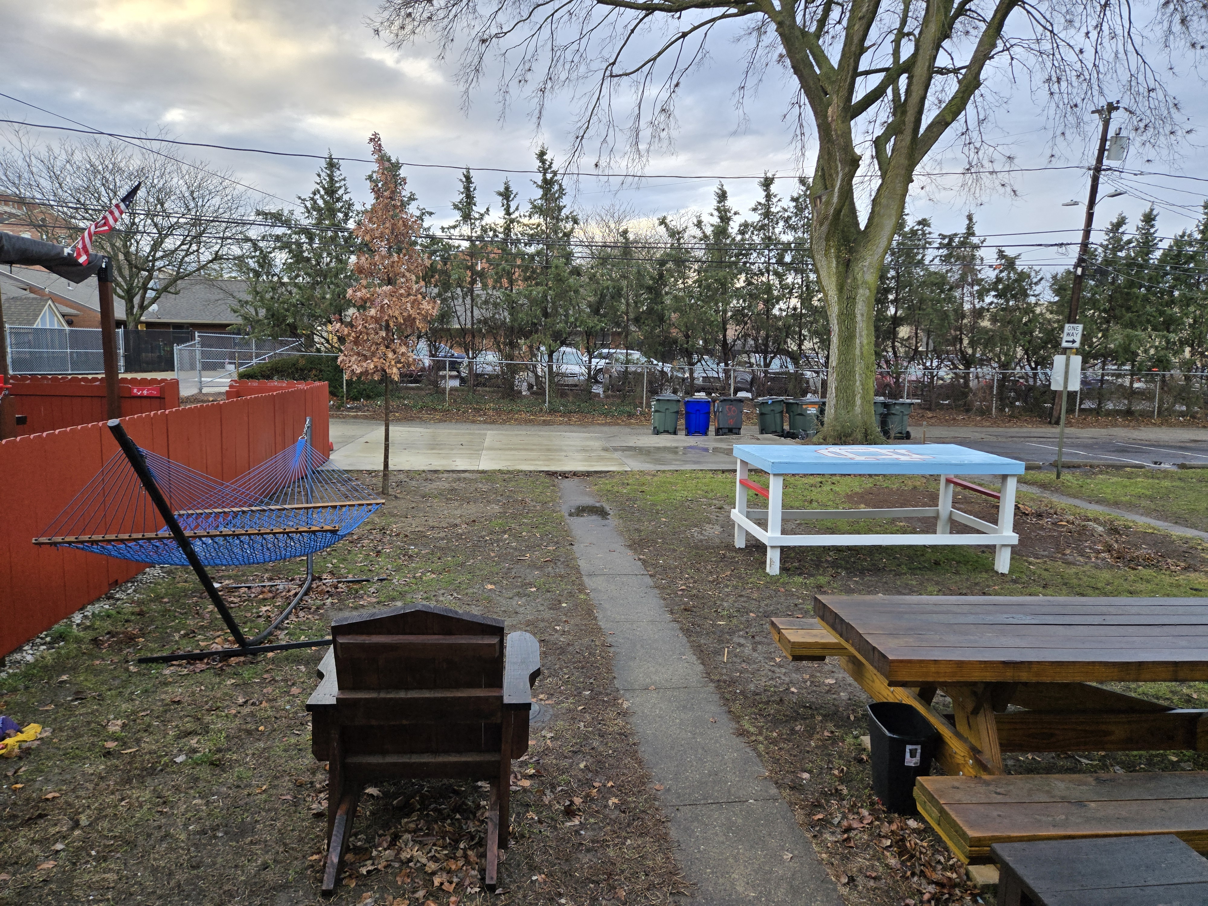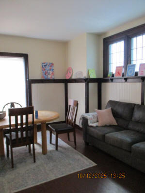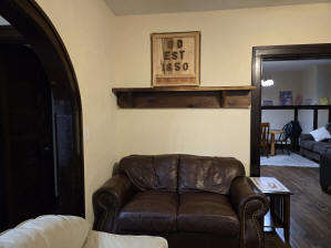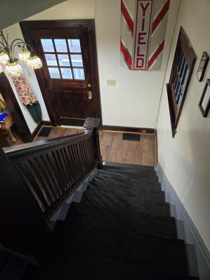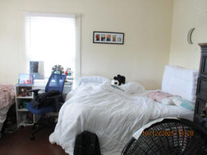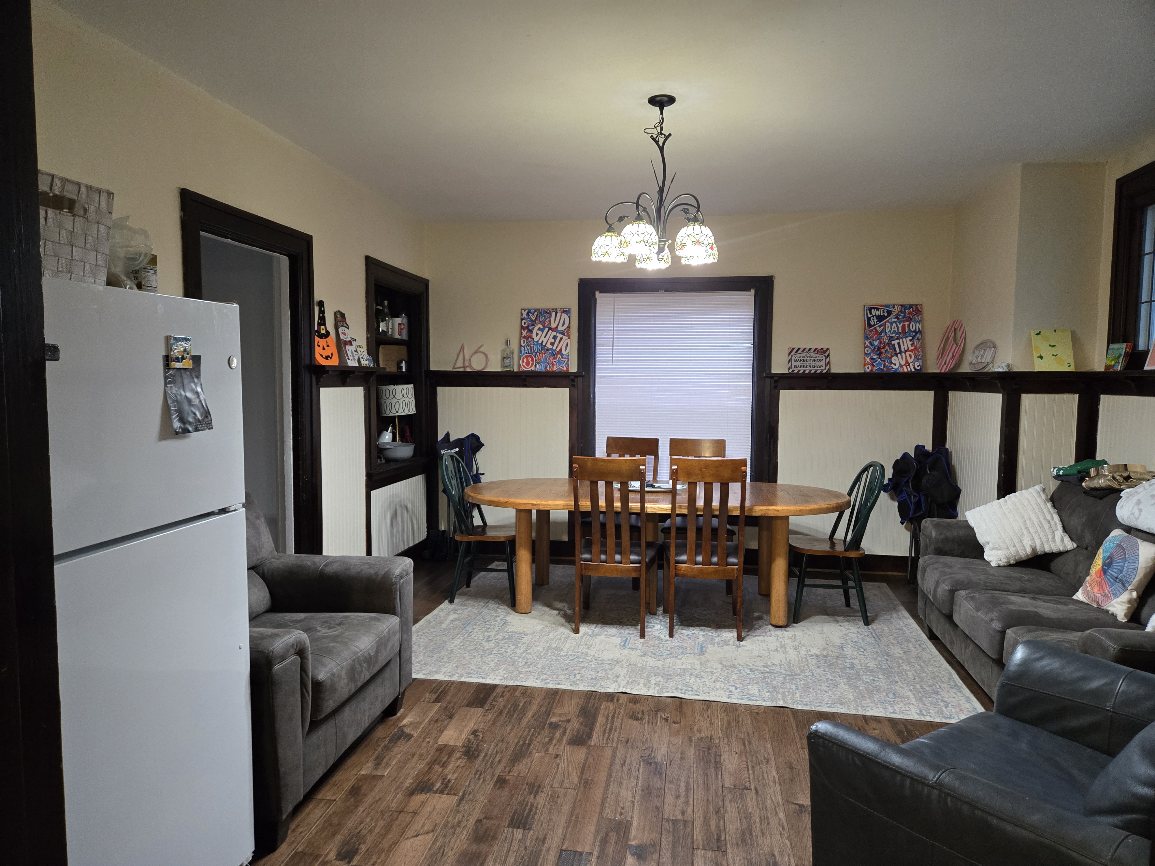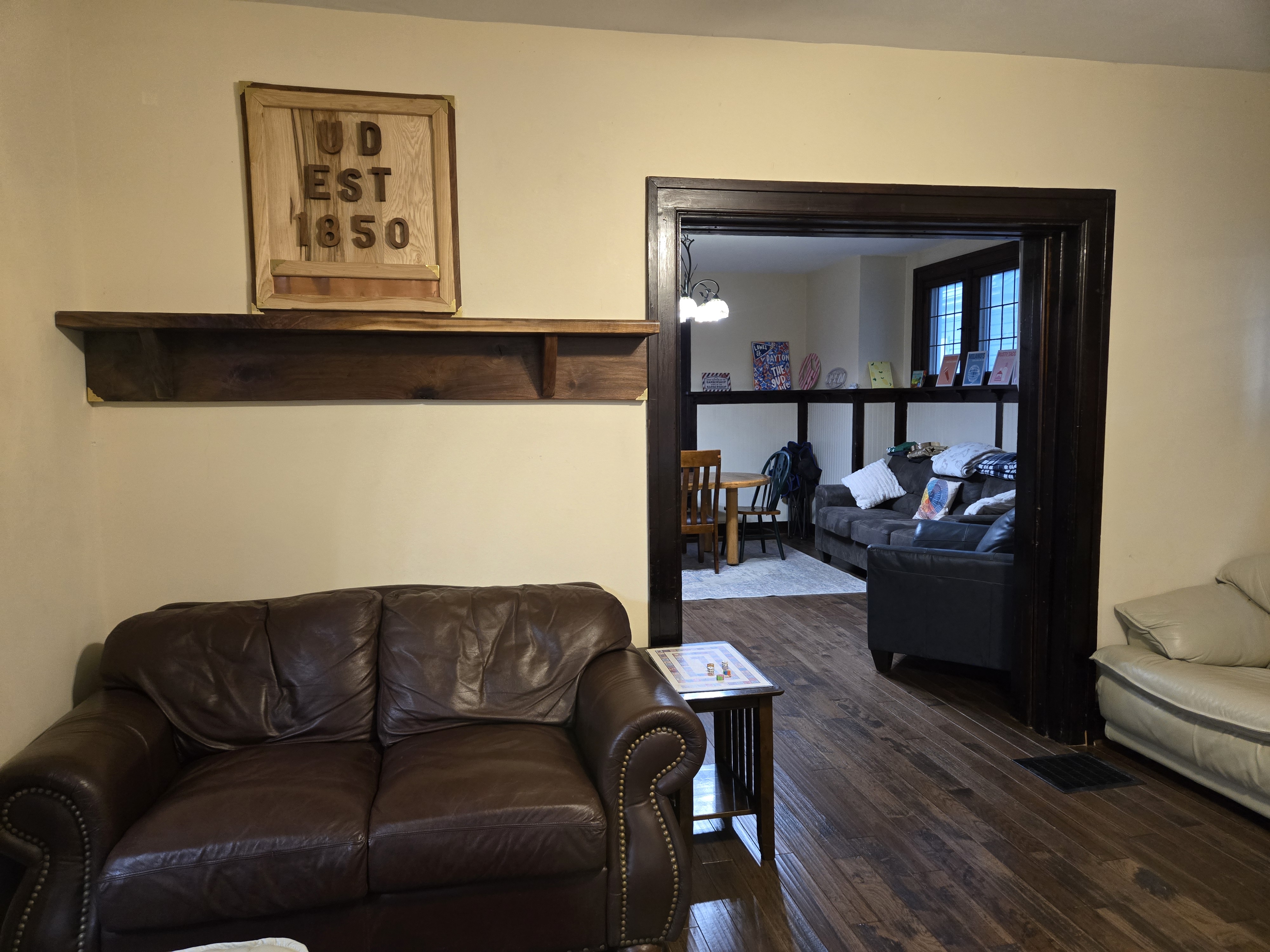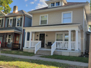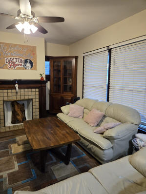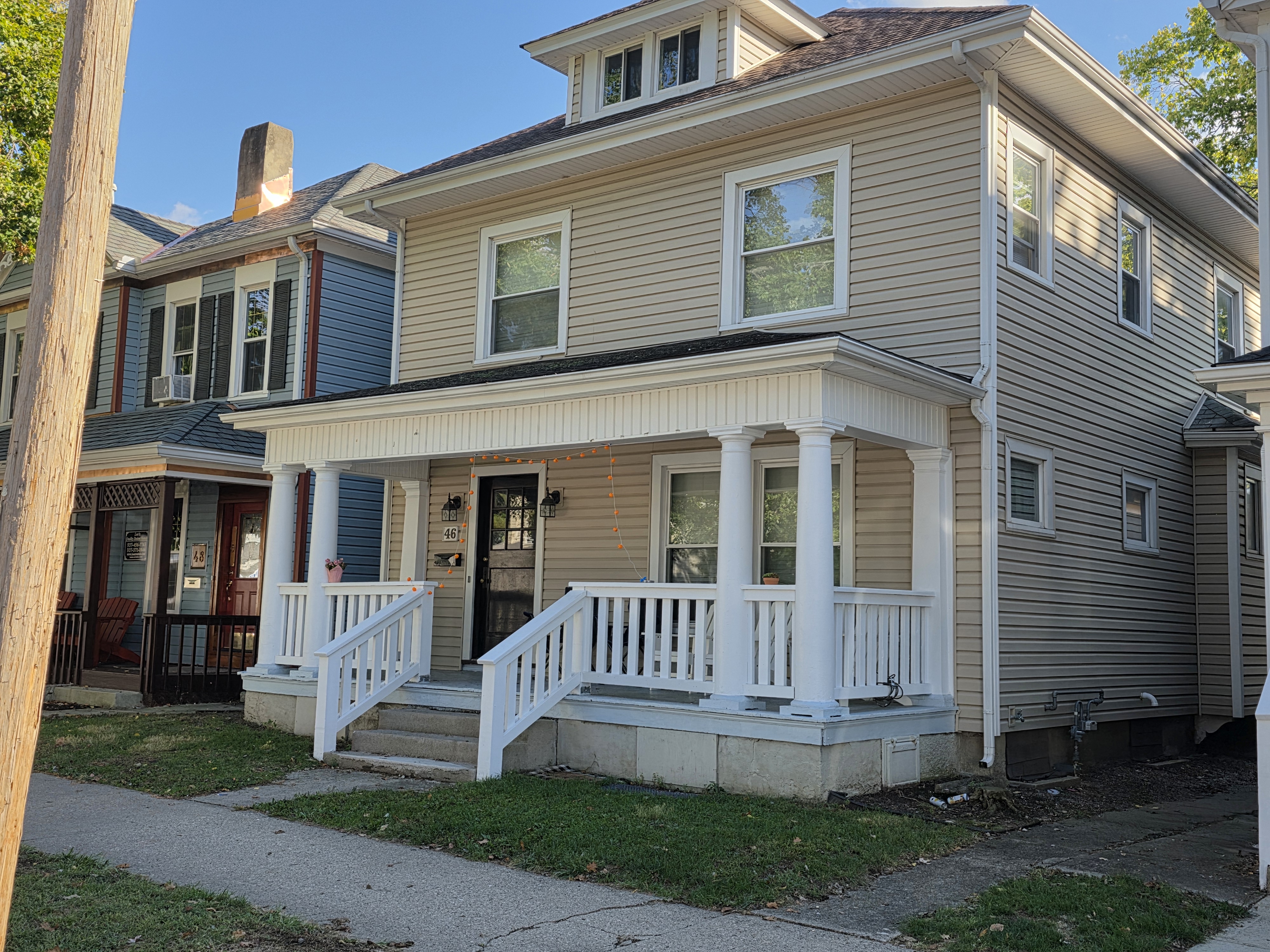 46 Woodland Avenue - right next door to our Tiki house at 48 and 50 Woodland Avenue This property has the following features: 3 large bedrooms, licensed to six students, one and half bathrooms, upstairs laundry, large living room and dining room, beautiful original wood front entry door and wood staircase, central heat and air conditioning, will be fully furnished, will have a nice new concrete pad in backyard, picnic table, new grill, hammock, beatiful stones in backyard this summer. Best of all, you are half a block from campus and all the fine restaurants!! As with all our properties, maintenance is included. (Click on any of the below pictures to see an enlarged view) New updated pictures at the beginning of each room section. Recent updates over winter break: new toilets, new dishwasher, new hardwood hickory flooring installed down stairs, new stair treads for upstairs staircases and basement staircase, new picnic table, hammock, adirondack chair added in backyard, new lighting in kitchen, living and dining rooms; large multi room basement cleaned out, painted and dry locked, new glass block windows and furniture, a great space to hang out in! More front and current back yard views (back yard to have poured concrete pad in backyard, new grill, hammock, picnic table, large stones added this summer Good size living room with faux fireplace, beautiful wood staircase and original wood front entry door Good size kitchen with dishwasher, microwave, built in storage cabinet, new lighting, new dishwasher Storage room off of kitchen by back entrance, cleaned out and painted Downstairs half bathroom off of kitchen, repainted and new toilet LLLarge dining room, new hardwood hickory flooring new lighting Large living room with faux fireplace, beautiful original wood front entry door, beautiful wood staircase, new hardwood hickory flooring, new stair treads, new cabinet, custom UD sign, new lighting Newly cleaned out basement with plenty of space to gather, with new glass block windows, tabe and chairs, stair treads Current backyard, with hammock, picnic table, and adirondack chair, parking pad, (to be updated spring 2026 with poured concrete backyard space) Large upstairs bathroom with big shower, shelving unit, new toilet, new glass showe doors Upstairs laundry Triple bedroom with three closet spaces Double bedroom with two closet spaces Single bedroom, good size closet space Unfinished attic bonus space This page last updated 1/23/2026